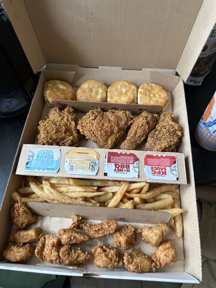 12 Extra Crispy Tenders, 2 large sides of your choice, 6 dipping sauces, and 4 biscuits